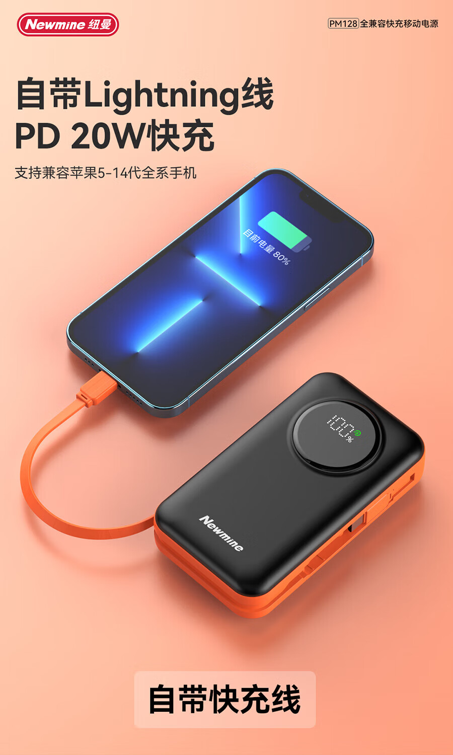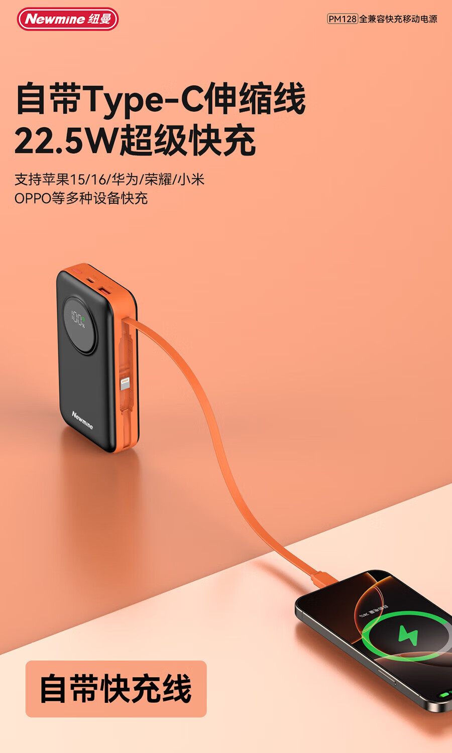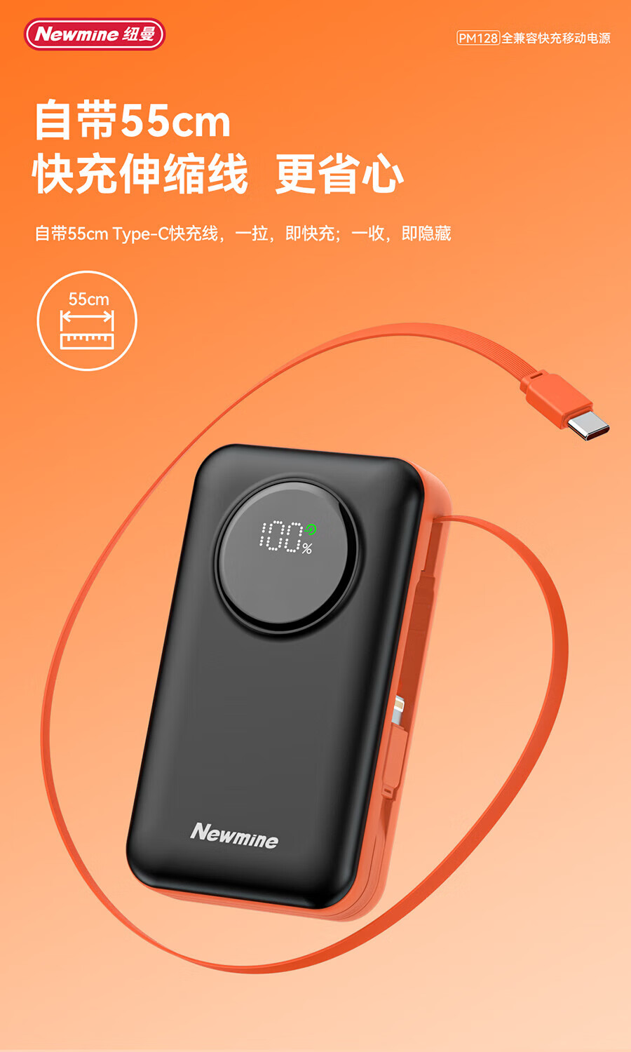 纽曼10000毫安伸缩线快充充电宝PM128 黑