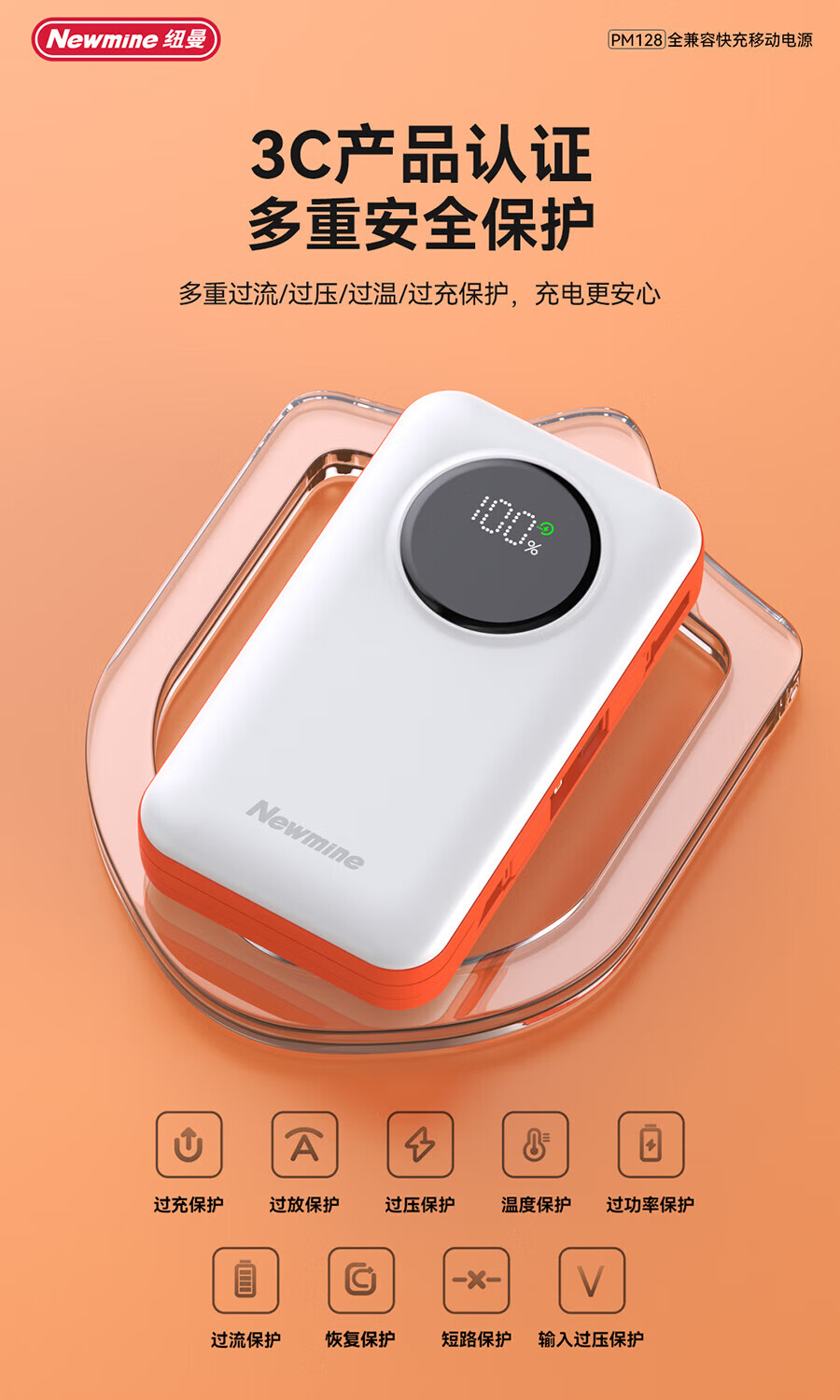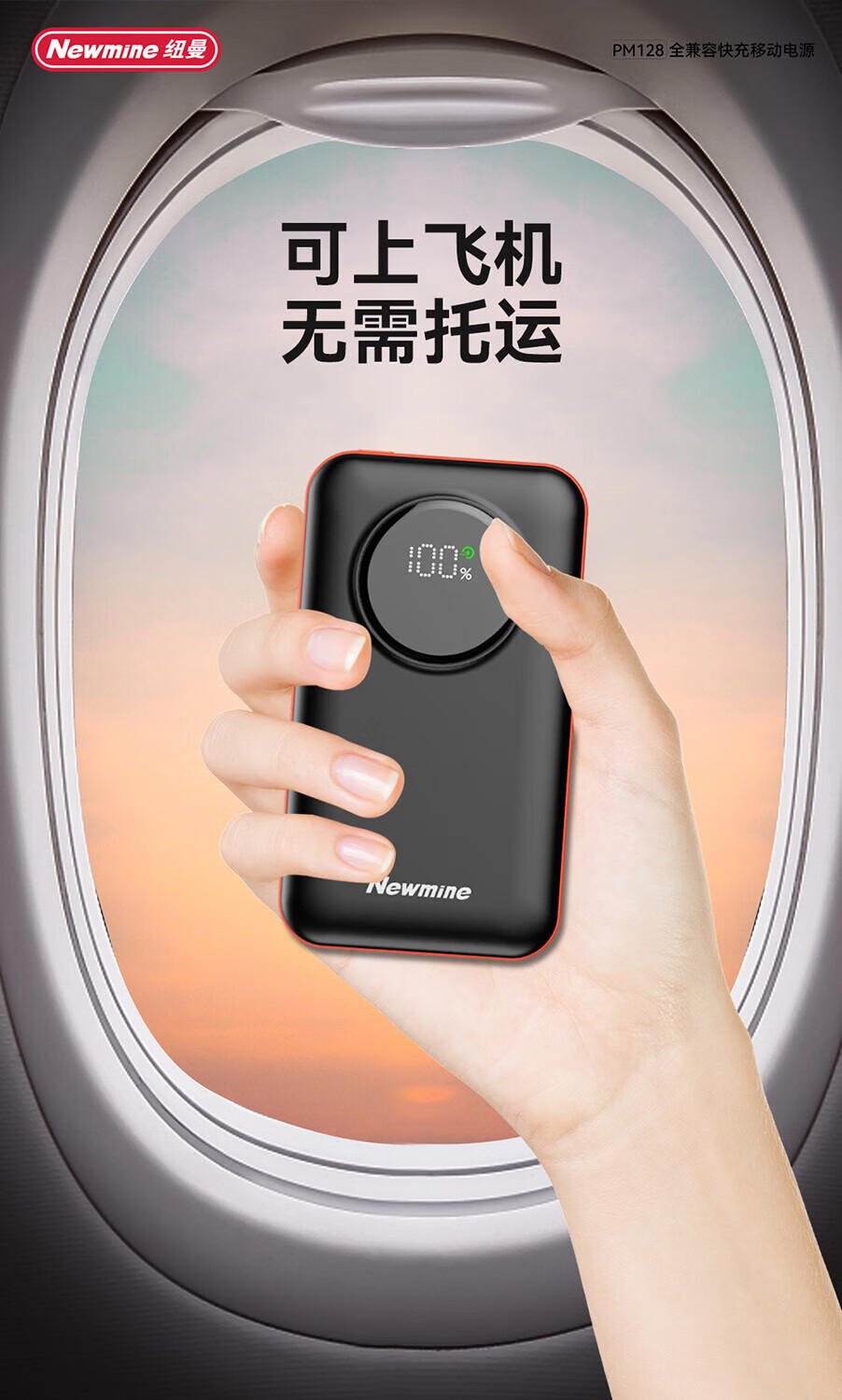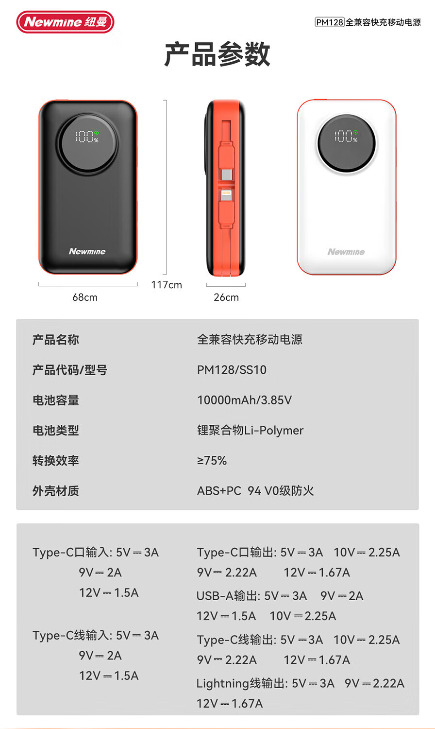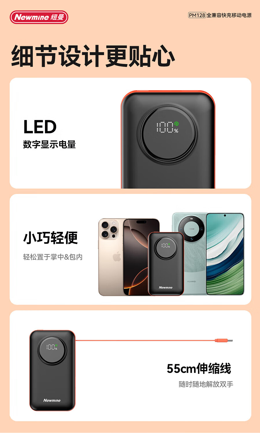 纽曼10000毫安伸缩线快充充电宝PM128 黑