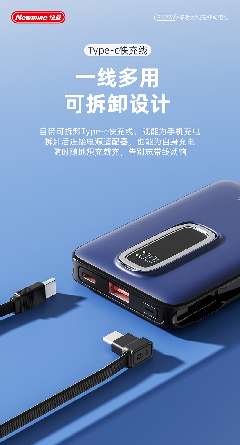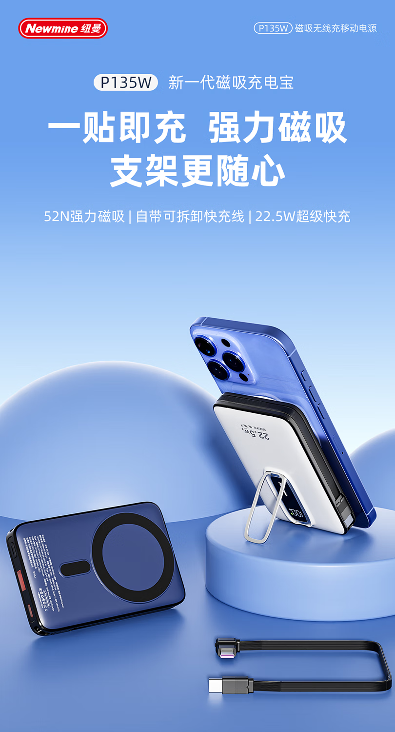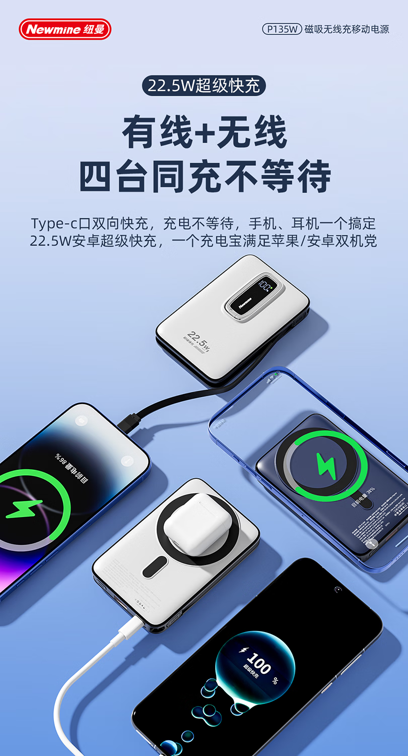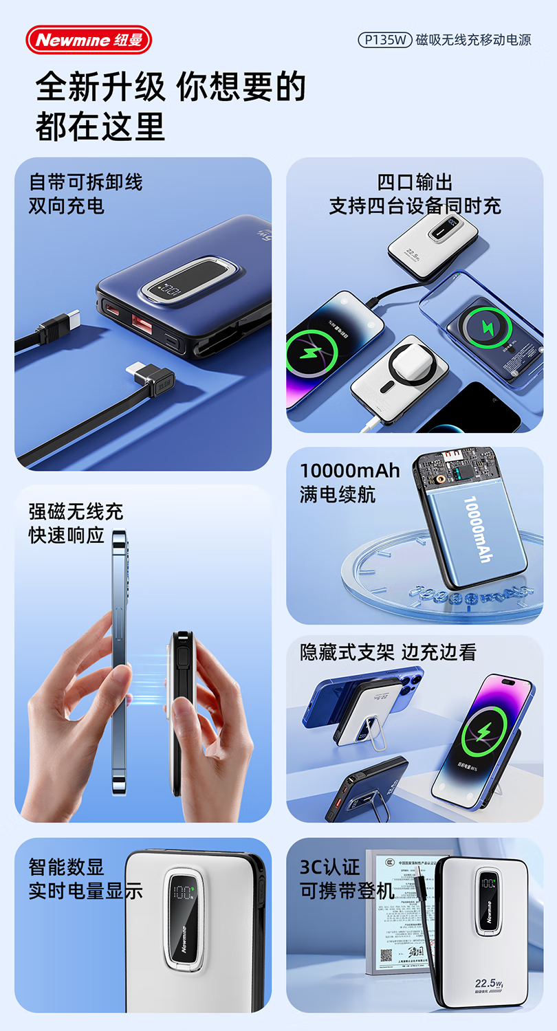 纽曼10000毫安无线磁吸带线快充充电宝P135W