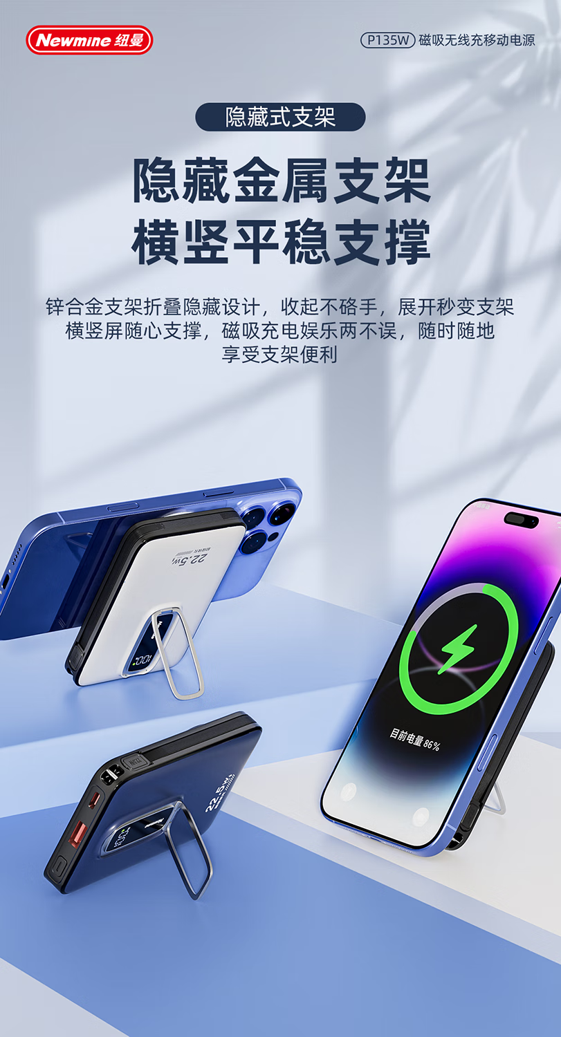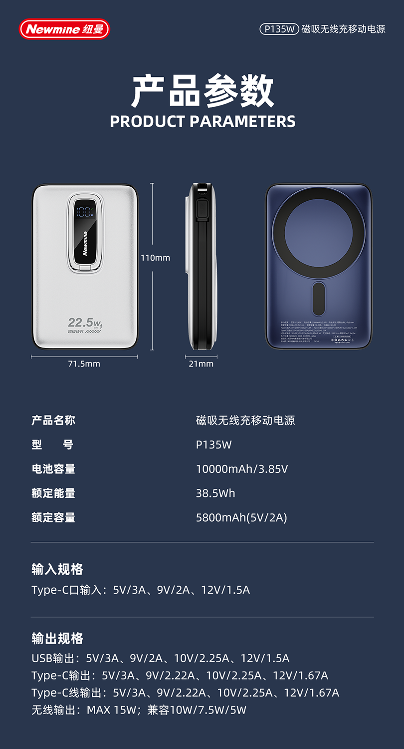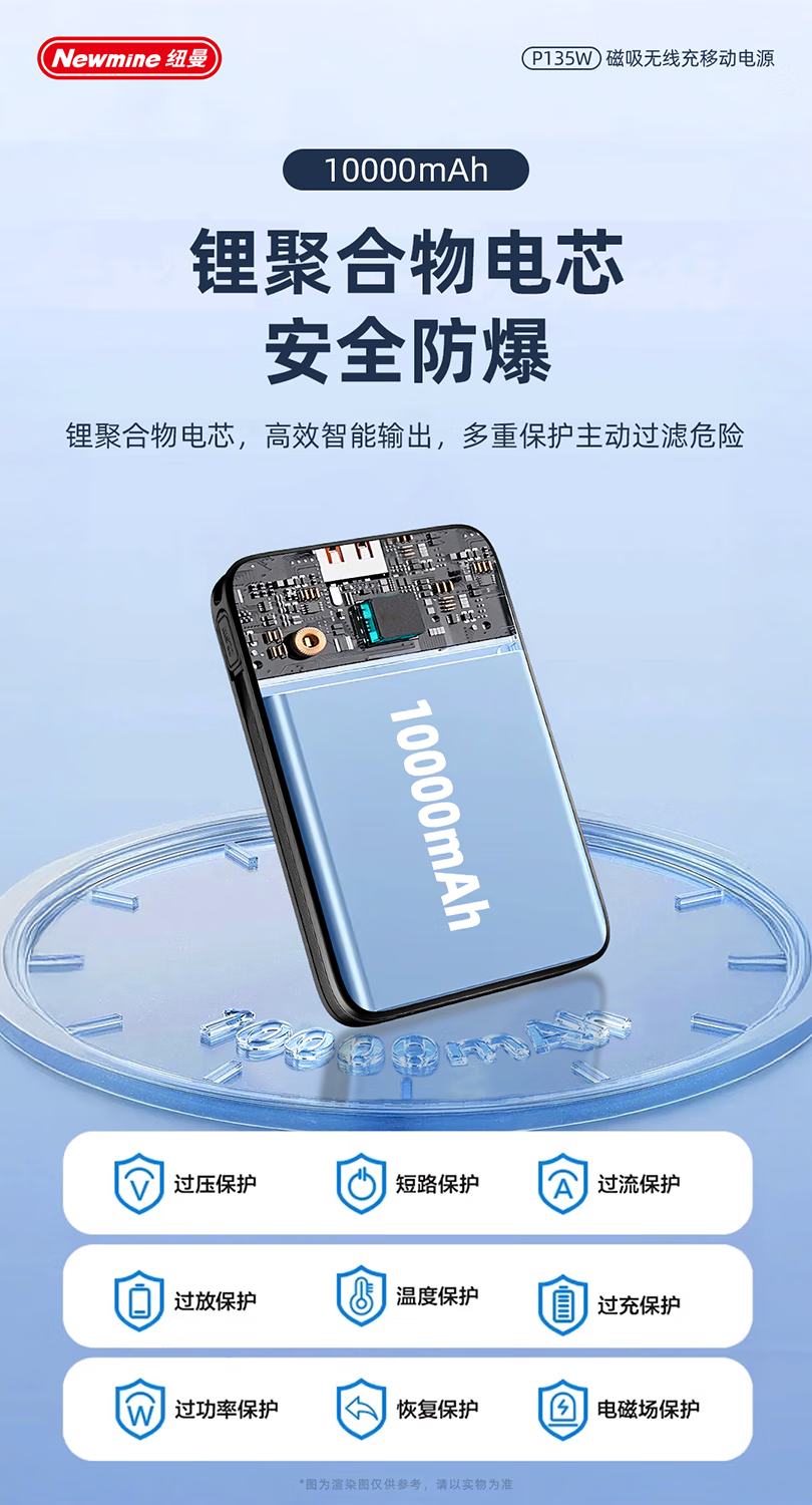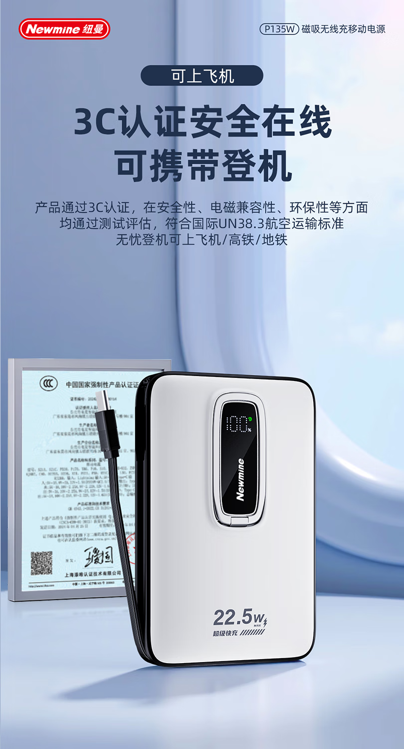 纽曼10000毫安无线磁吸带线快充充电宝P135W